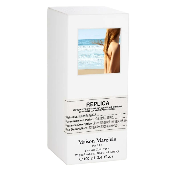 Giống như các phiên bản khác trong dòng Replica, Beach Walk EDT mang thiết kế chai thủy tinh trong suốt với nhãn vải trắng đặc trưng, trông như một mẫu “nhật ký hương thơm” của Maison Margiela.